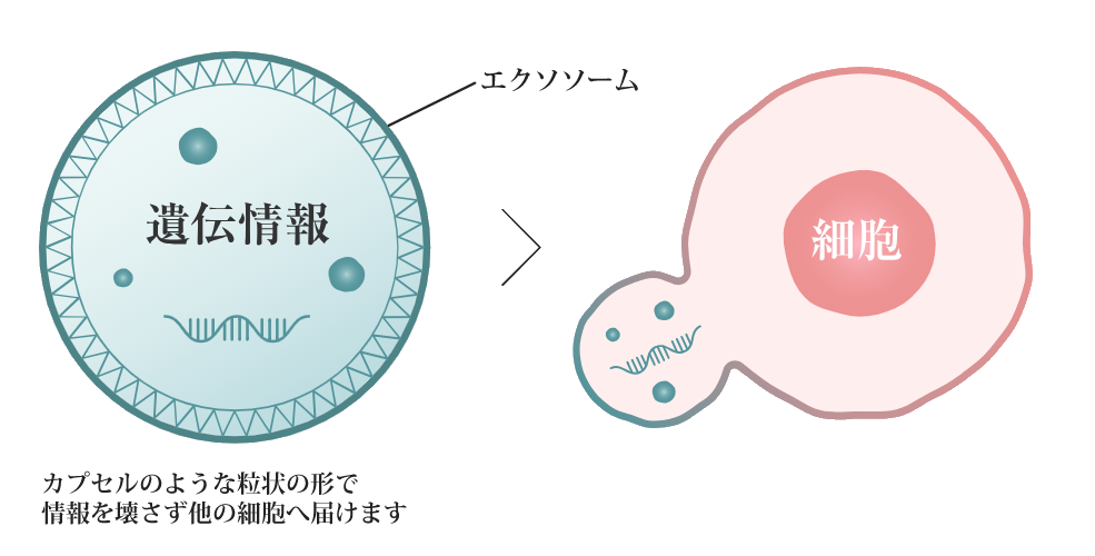 エクソソームは損傷を受けた細胞に集まり、内包する遺伝子(メッセンジャーRNA)の働きで、標的となる細胞が自力で回復できるように働きかけます。マイクロRNAは非常に壊れやすく、そのまま細胞外に放出されるとすぐに分解されてしまいますが、エクソソームが中に包み込んだ状態で、細胞の外へと袋のまま放出するので大切な情報は壊れずに他の細胞へと無事に伝達することができます。